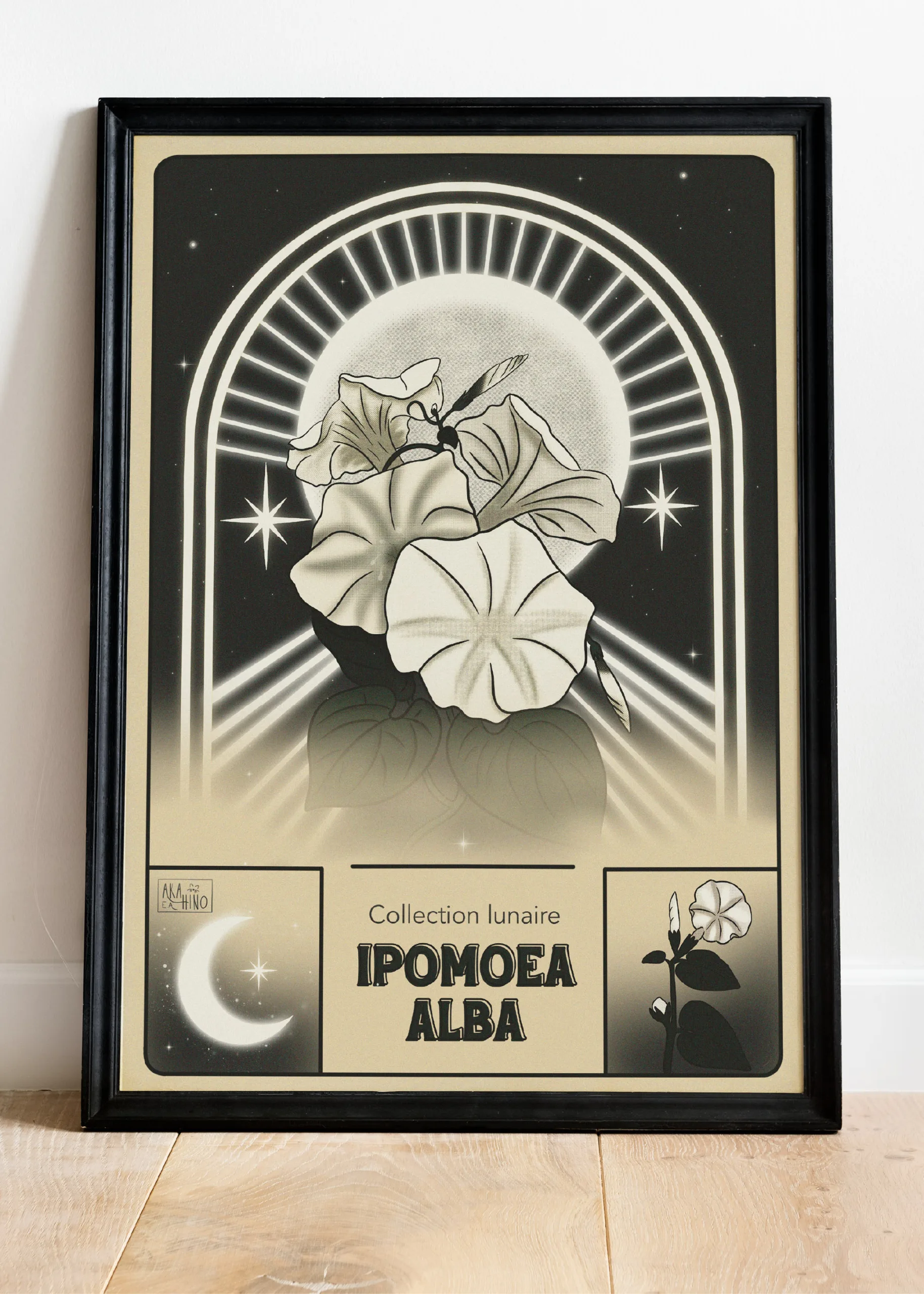 Inspirée des affiches botaniques vintage, cette pièce mêle tons chauds, textures rétro et poésie nocturne.