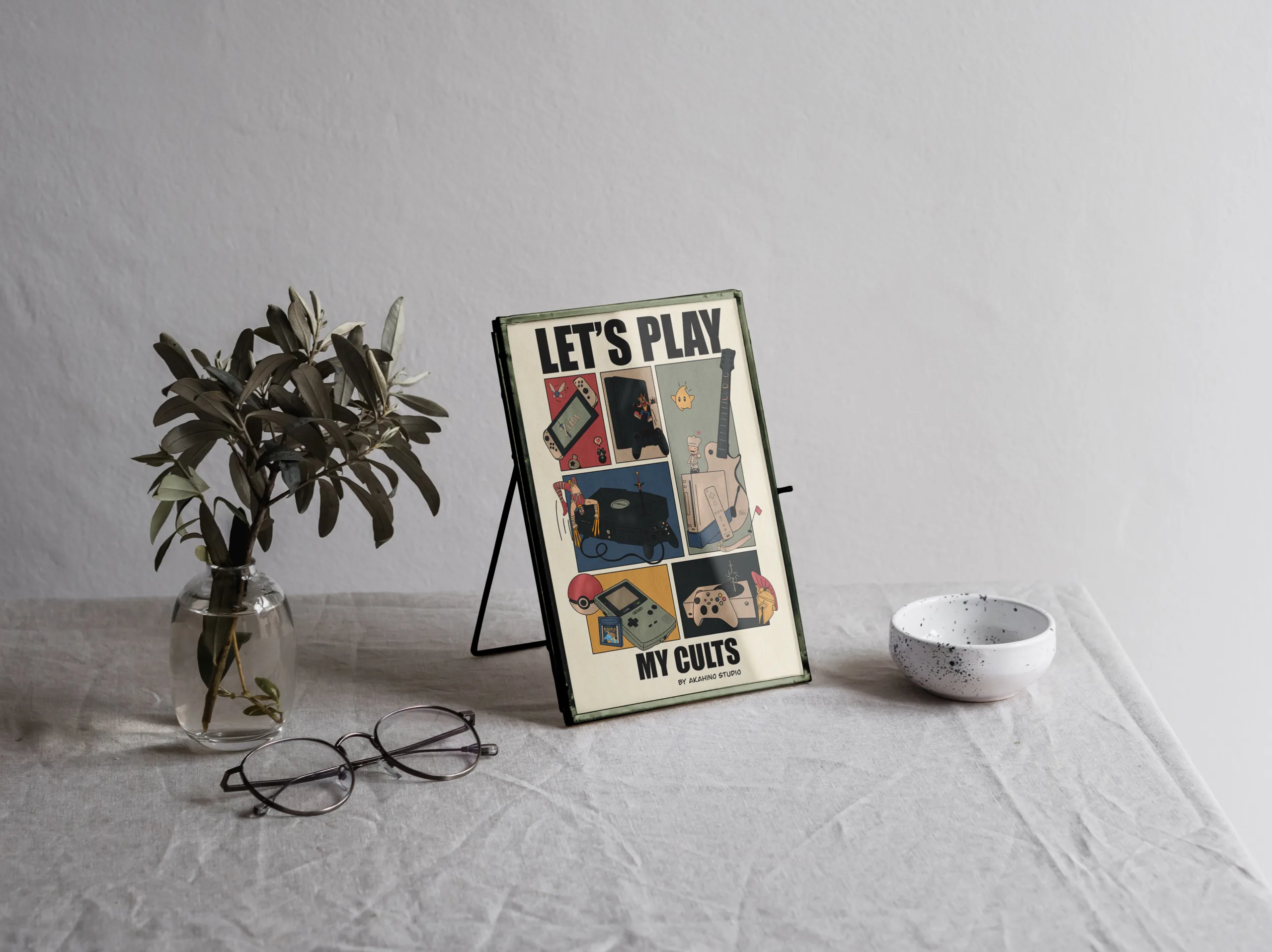 LET’S PLAY – MES CULTES est une illustration hommage à mon propre univers de joueuse, aux objets et licences qui ont marqué mon histoire et mes années gaming console.