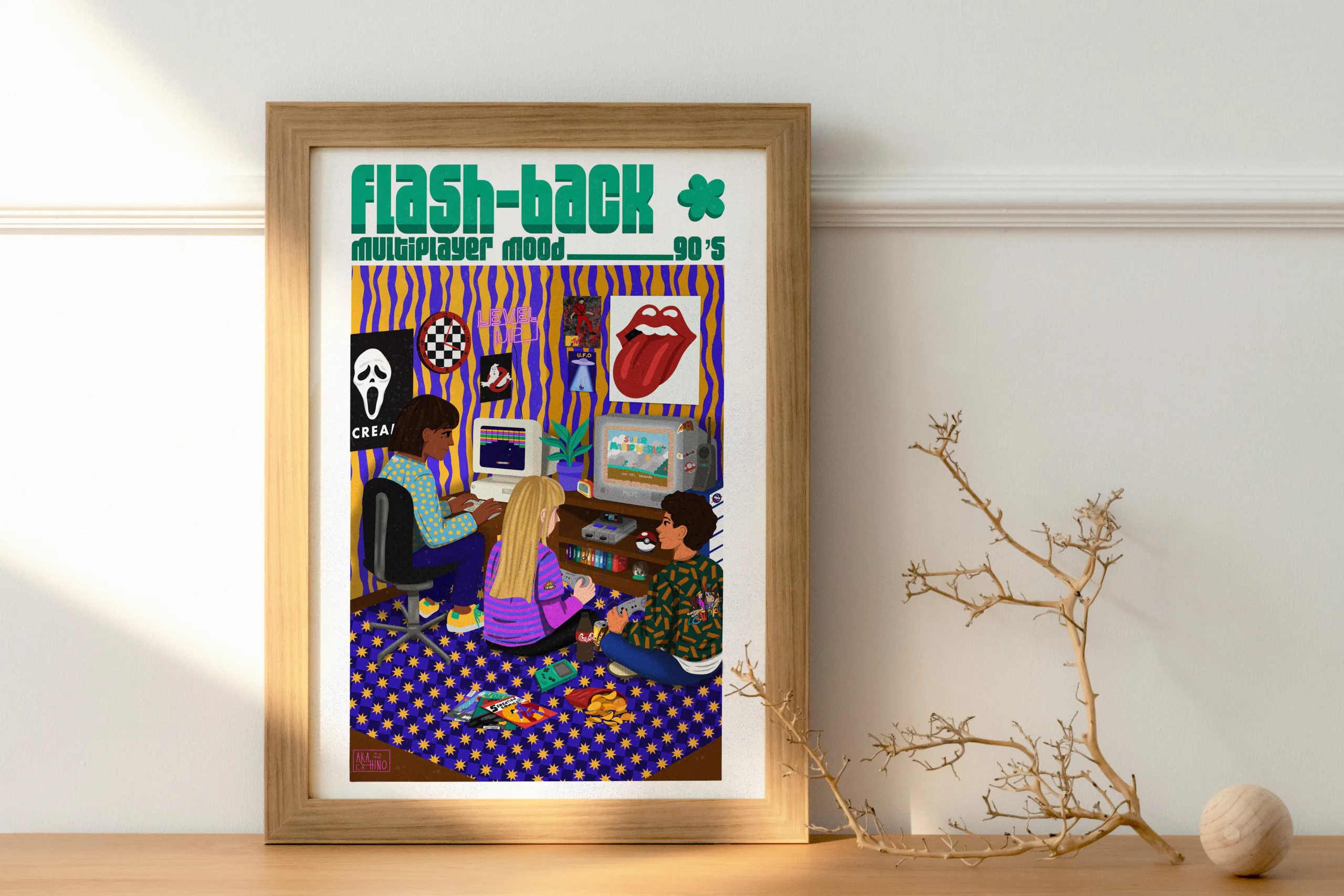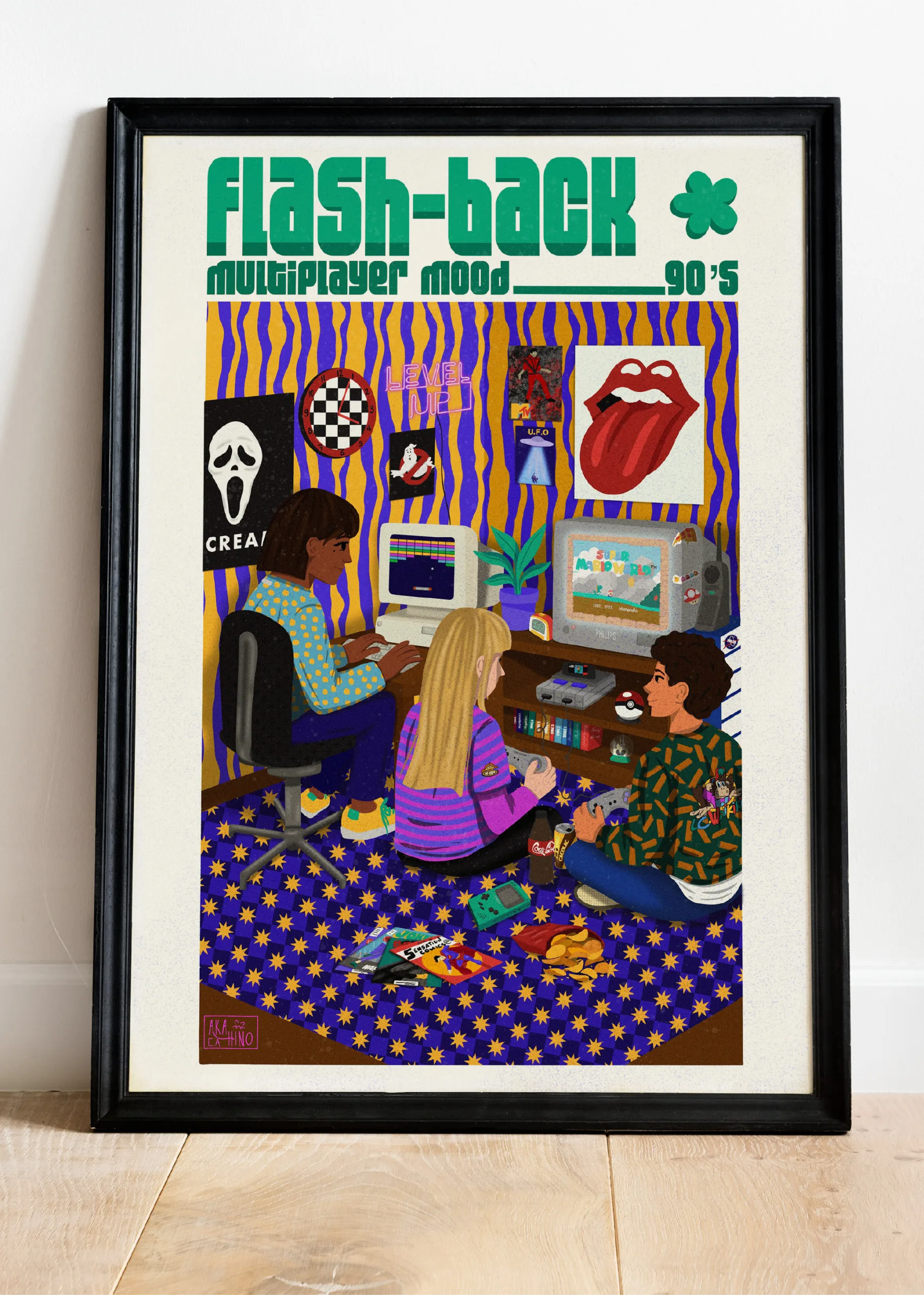Cette illustration regorge de détails rétro : moquette étoilée, stickers old-school, écrans cathodiques, objets cultes, snacks au sol… Tout y est pour replonger directement dans l’ambiance chaleureuse et colorée des parties multijoueur de cette époque.
