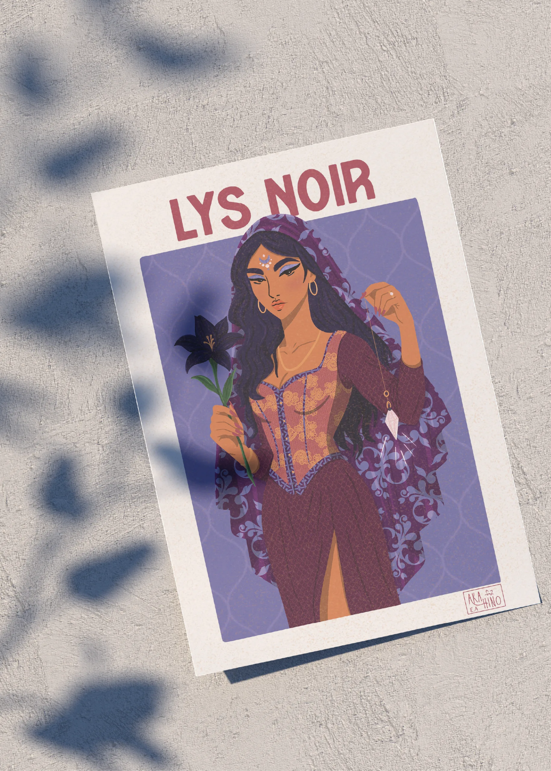 Black Lily incarne une féminité mystique, puissante et insaisissable. Inspirée par le lys noir, symbole de secret, de spiritualité et de profondeur, cette illustration dépeint une femme connectée à l’invisible, libre et intuitive. Drapée dans une allure envoûtante, elle mêle l’esthétique ésotérique à une élégance moderne, tenant un pendule comme un prolongement de son pouvoir intérieur.