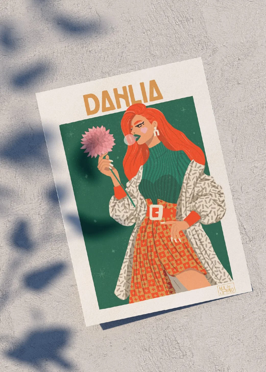 Issue de la collection Floral Queens, cette illustration célèbre la femme dans toute sa singularité et son éclat. Inspirée par le dahlia, une fleur symbole de force, de passion et d’élégance, elle dégage une énergie vibrante et assumée.