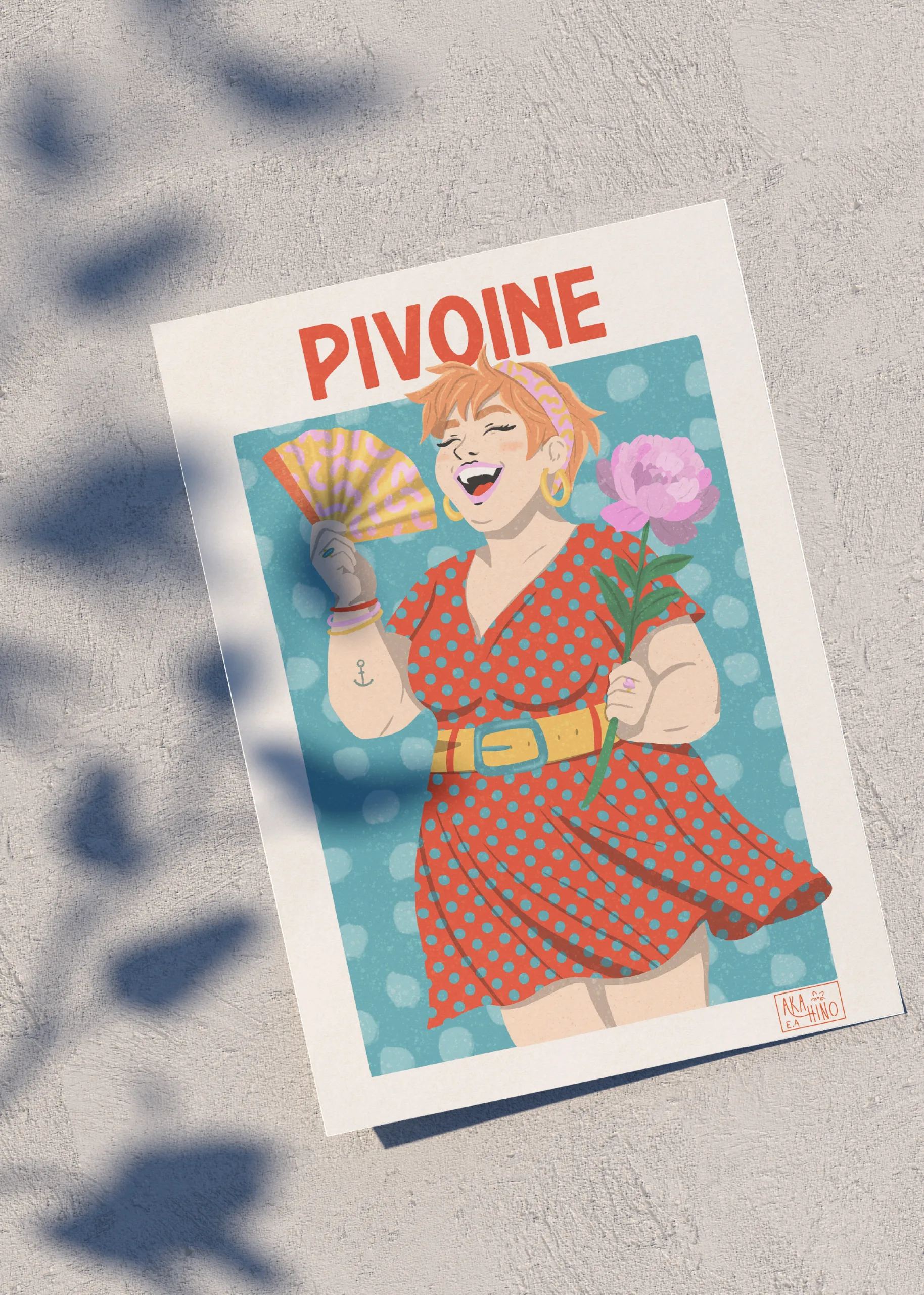 La Pivoine est généreuse, joyeuse et vibrante. Inspirée par cette fleur abondante et colorée, l’illustration met en lumière une femme pleine de vie, au rire franc et communicatif. Elle célèbre l’authenticité, la joie assumée et la beauté exubérante.