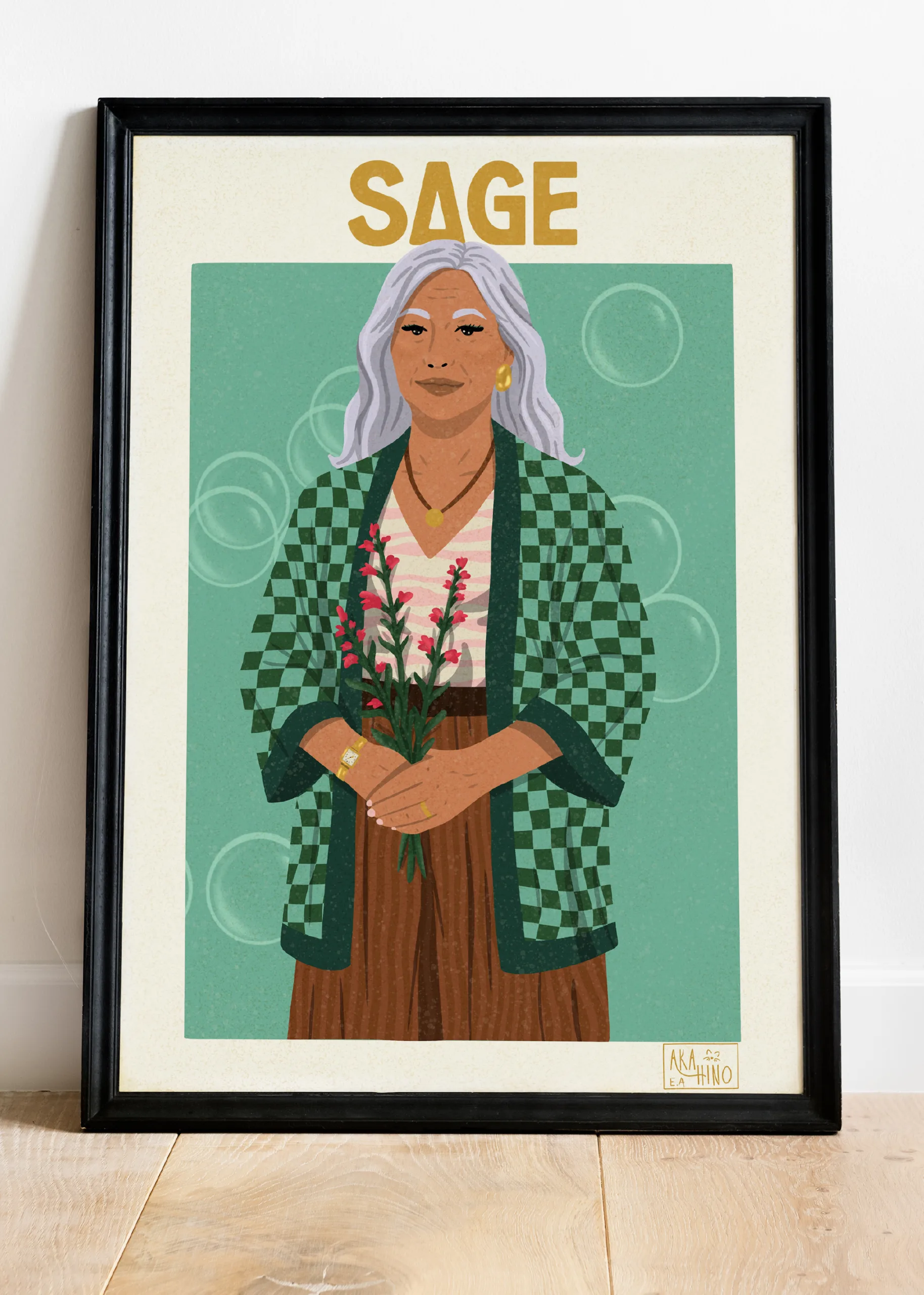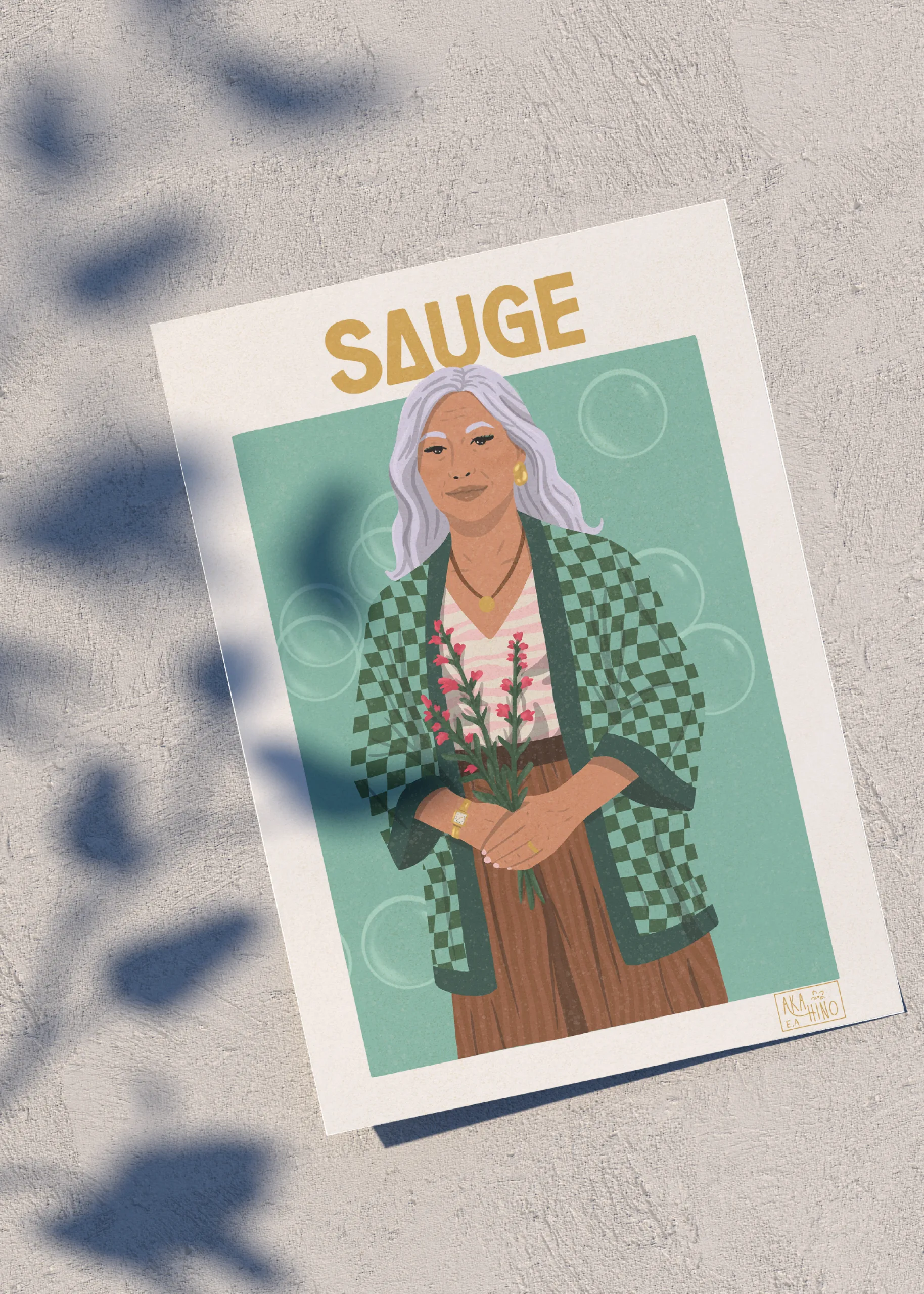 La Sauge incarne la maturité, la force tranquille et la protection bienveillante. Inspirée par cette plante ancestrale aux vertus purificatrices, cette illustration met en avant une femme d’âge mûr, digne et apaisée, qui veille avec sérénité. Elle symbolise la transmission, l’ancrage et la sagesse gagnée au fil du temps.