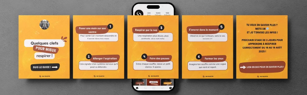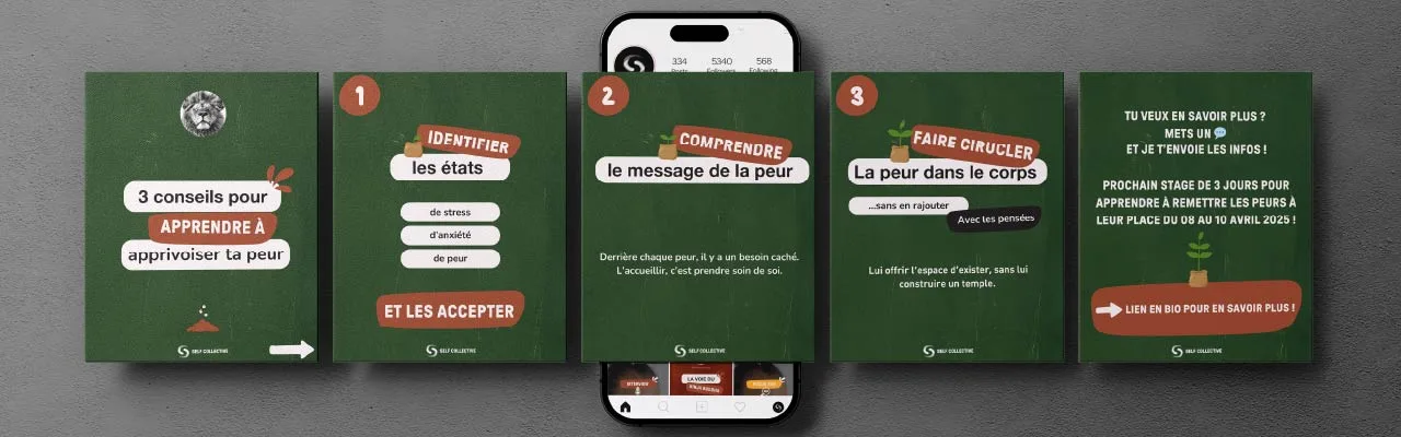 L’objectif de notre collaboration était de conserver la structure existante de son identité visuelle tout en lui insufflant plus de vie, de chaleur et d’humanité. Pour cela, j’ai conçu une série de templates personnalisés pour sa communication instagram : à la fois clairs, dynamiques et plus accessibles visuellement.