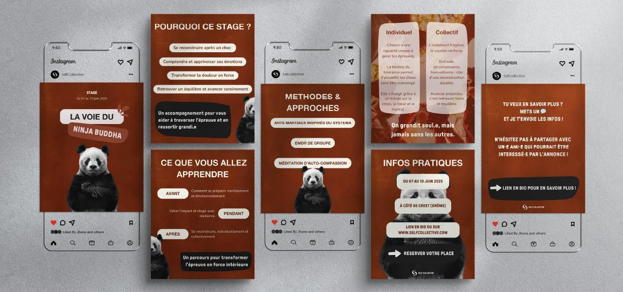 Pour renforcer cette approche, j’ai également créé plusieurs personnages illustrés, un ninja buddha et des suricates, qui ponctuent certains contenus avec une touche d’humour, de décalage et de storytelling. Ces personnages permettent de transmettre des messages parfois complexes de manière plus ludique et mémorable.