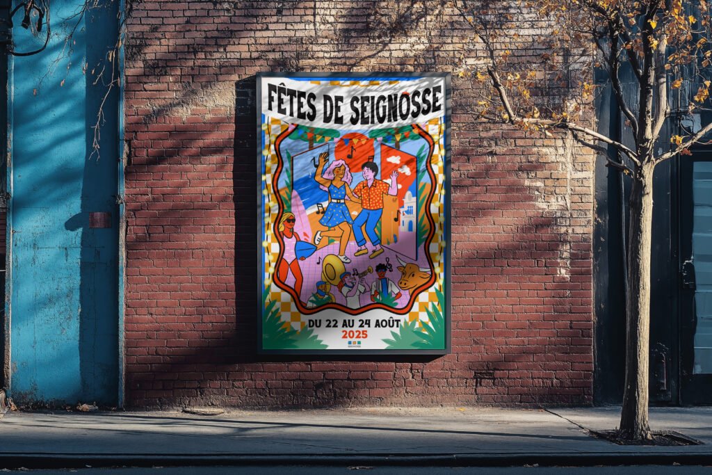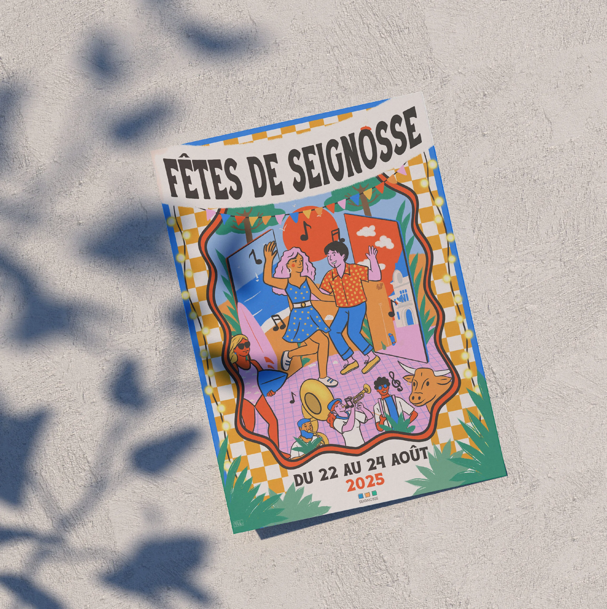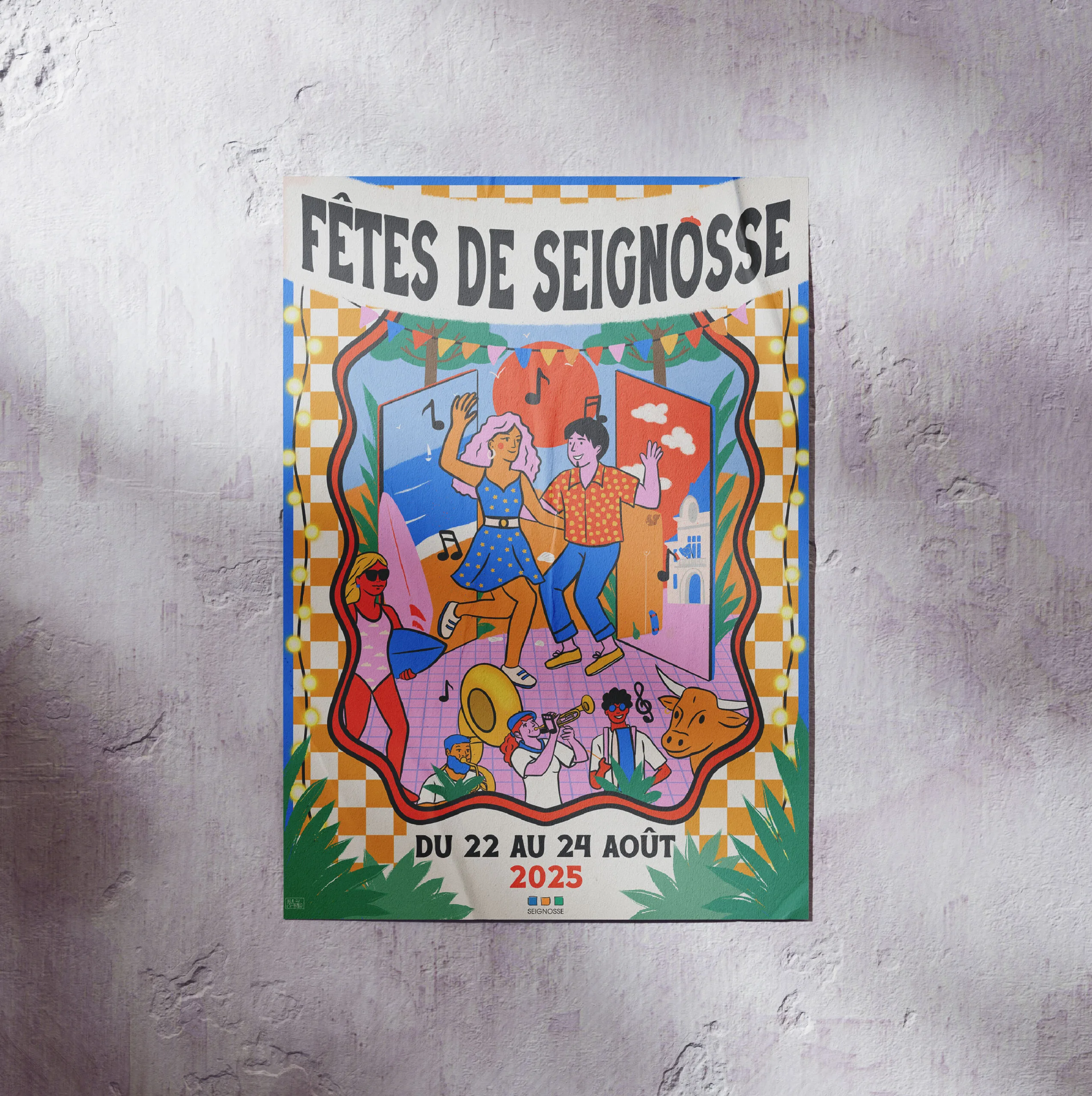 Des danseurs, des musiciens et une surfeuse occupent le centre de l’affiche : ce sont eux qui portent l’énergie du moment, dans un univers stylisé et expressif. L’ensemble forme un tableau vivant, pensé pour évoquer la chaleur de l’été, les rencontres, et la spontanéité des célébrations.