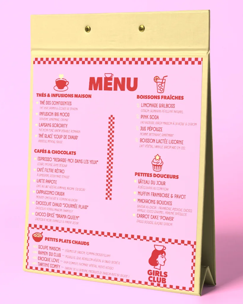 Chaque élément, du menu illustré au totebag, a été pensé pour prolonger cette sensation de safe place, où l’on peut à la fois ralentir, créer, et se sentir bien entouré·e.